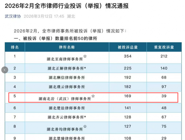 与此同时,北岩律所相关投诉并非一时一案。举报材料中提到,武汉律师协会有关月份的投诉通报中,该所曾连续位列投诉量靠前位置;从黑猫投诉平台等公开渠道也可以看到,与其相关的投诉并非孤立个案,而是持续出现。